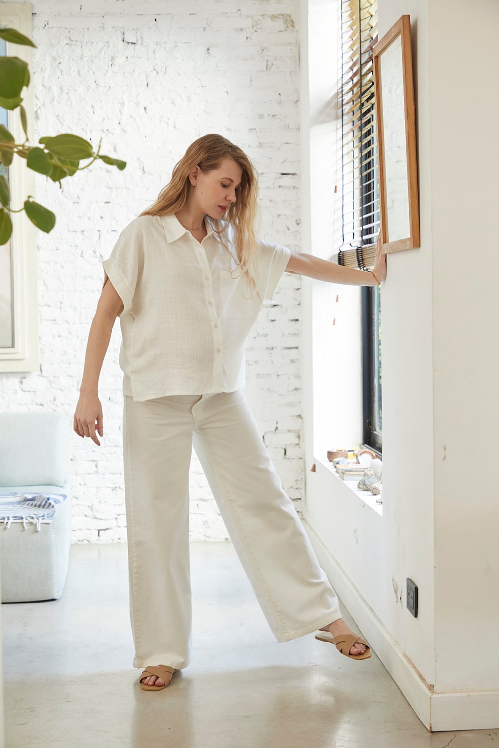 Camisa manga corta de lino super fresca con botones a tono divinos en delantero. De calce relajado y cómodo. Largo hasta la primera cadera super versátil, combínala con jeans, shorts o con faldas para un look mas casual y con pantalones sastreros para uno mas arreglado.