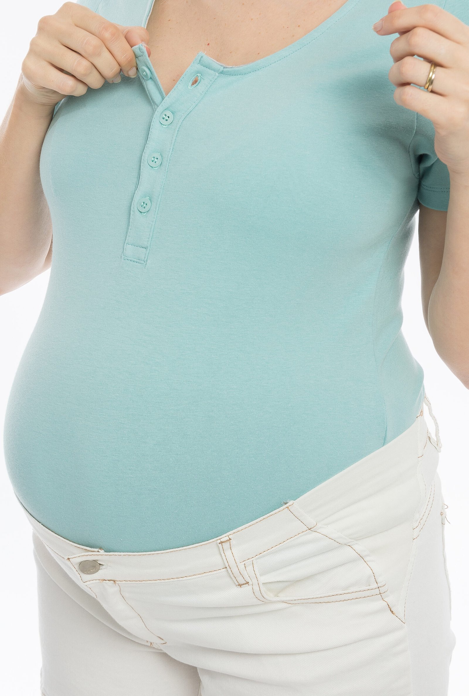 Remera calce al cuerpo, escote redondo con cartera abotonada.