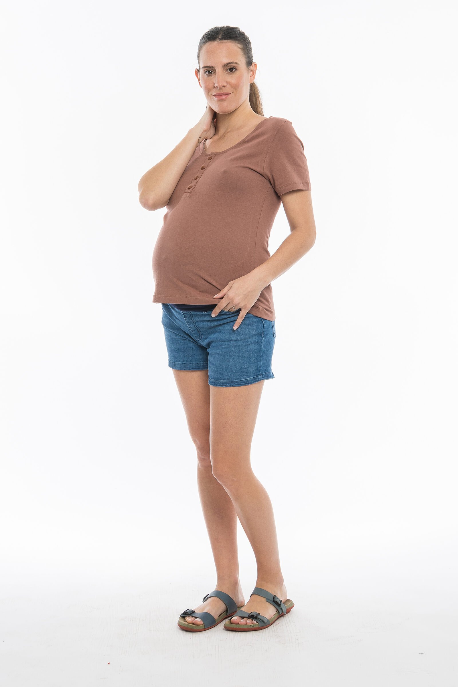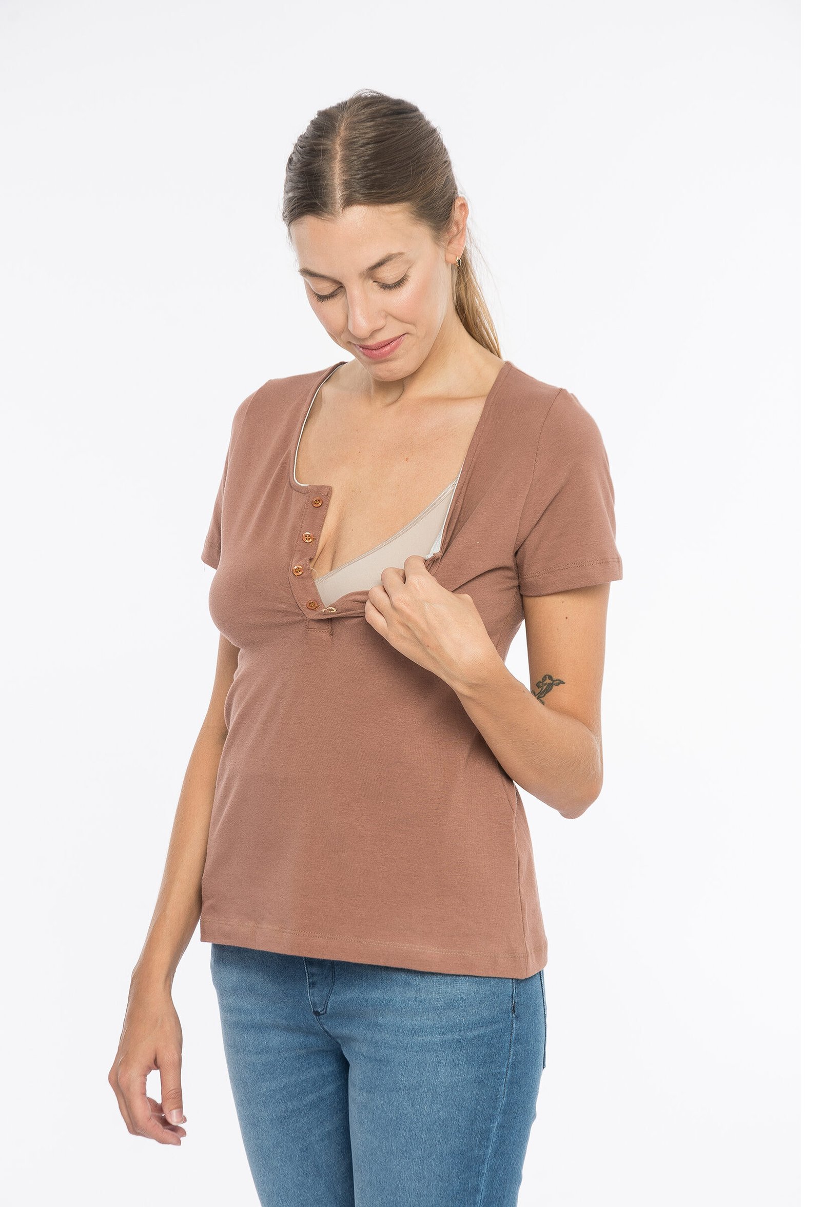 Remera calce al cuerpo, escote redondo con cartera abotonada.