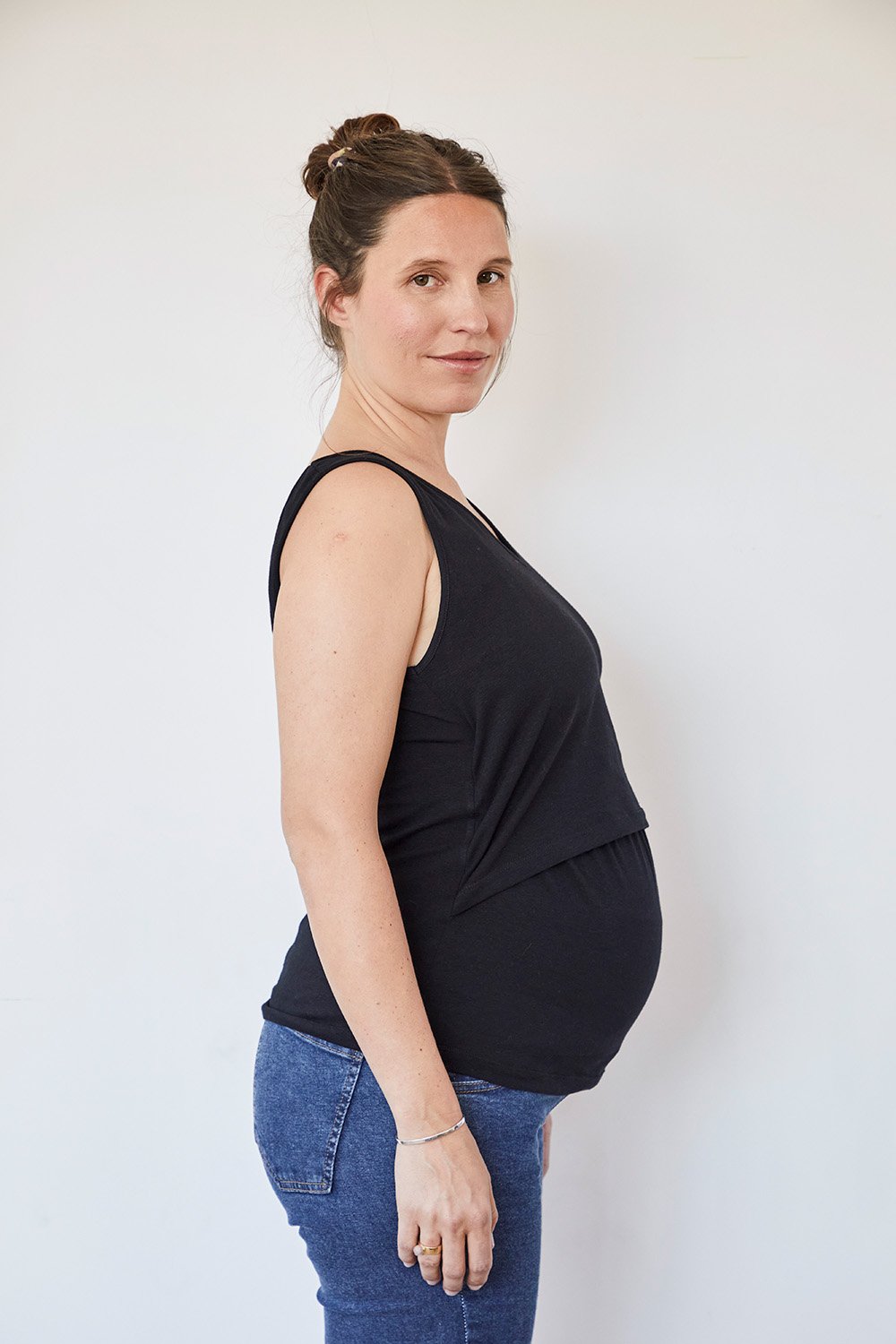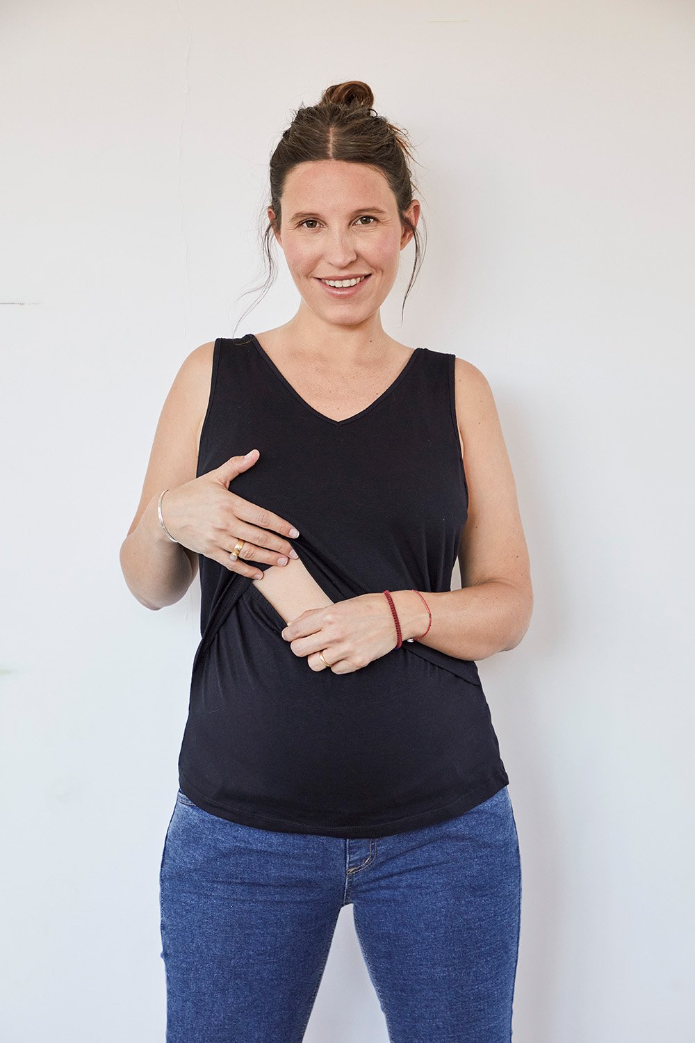 La musculosa Serena un básico indiscutible hecha en jersey de algodón de calce al cuerpo con breteles anchos cuenta con abertura oculta bajo el busto para facilitar la lactancia.