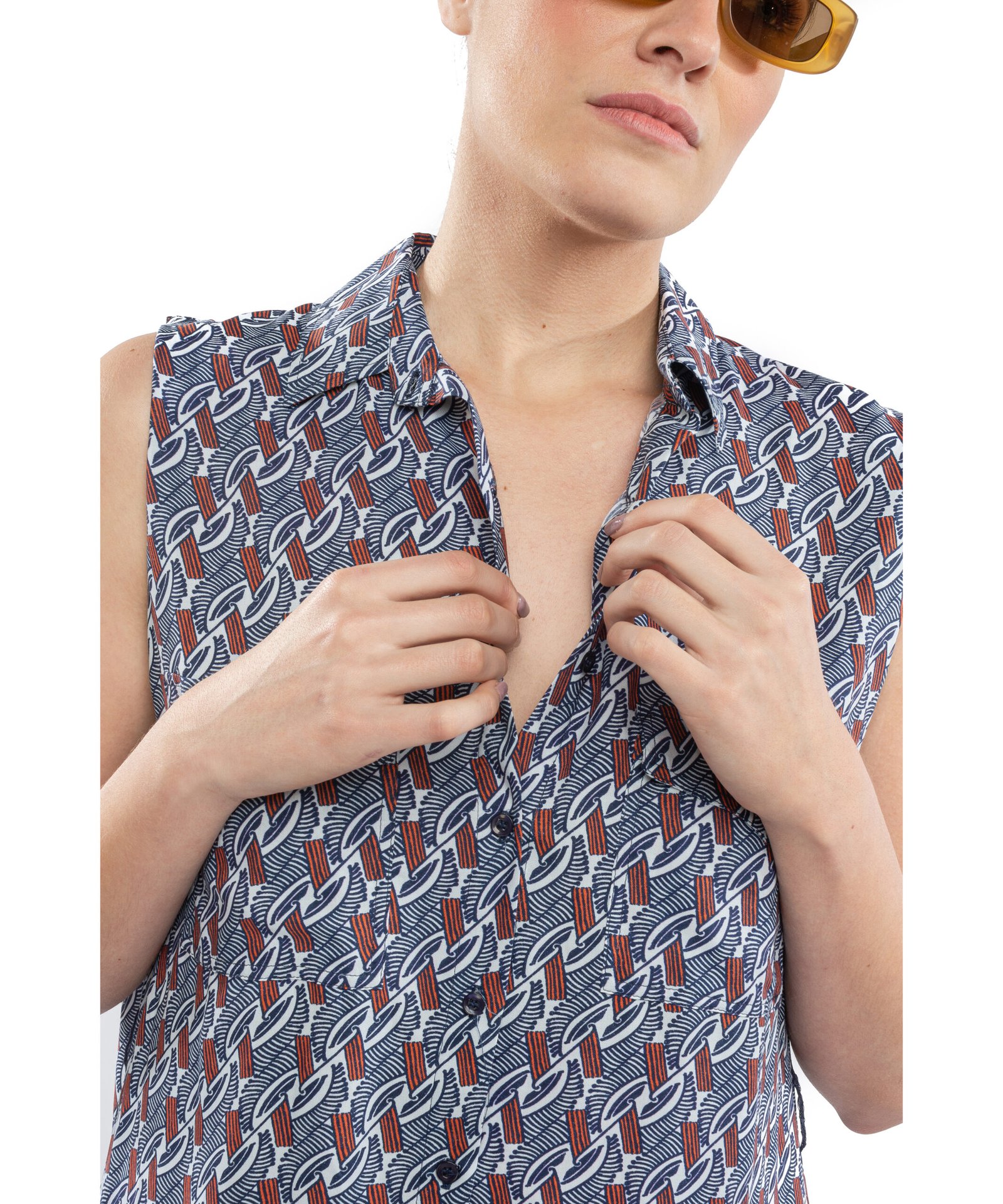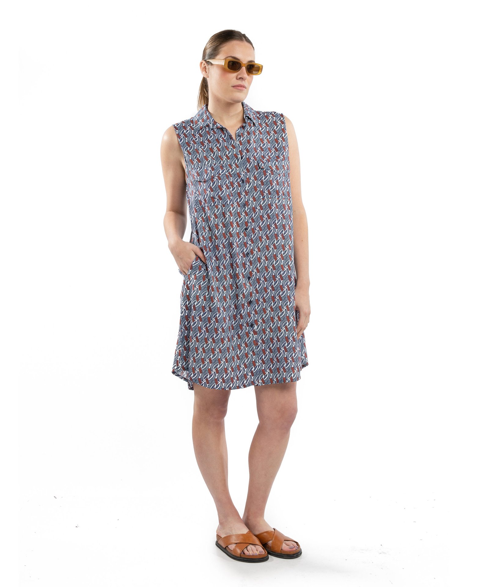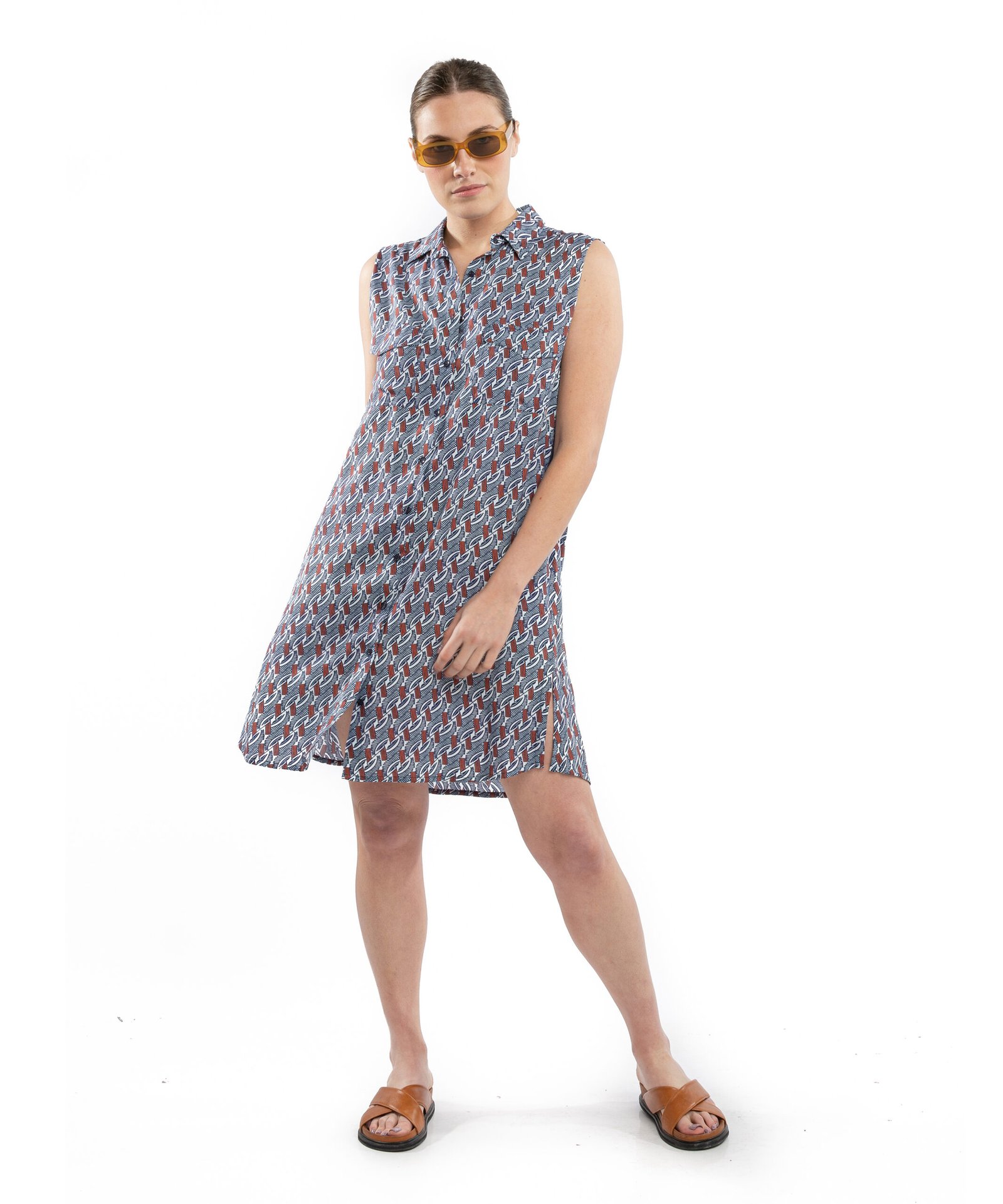 Vestido estampado calce amplio sin mangas, con cuello y cartera abotonada. Con bolsillos y cinturon para ceñir a gusto.
