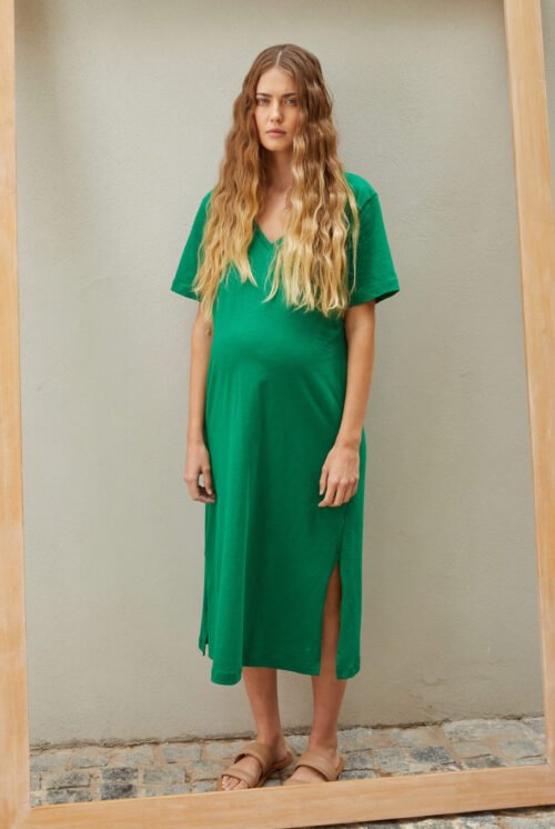 El vestido Cut out es un vestido corto de manga corta confeccionado en rustico liviano. Tiene un calce relajado, tiene un escote amplio redondeado bajo. Se destaca por su abertura en espalda y elástico que otorga flexibilidad permitiendo adaptarse a diferentes etapas del embarazo. Cuenta con tajos en los laterales.
